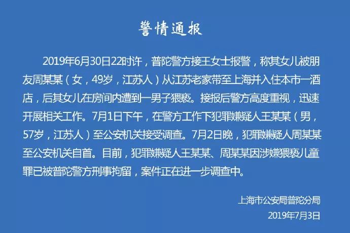 3日下午,多家媒体曝出王振华因猥亵女童被上海警方采取强制措施。晚间9时许,上海市公安局普陀分局通报:涉嫌猥亵儿童的嫌疑人王某某于7月1日至公安机关接受调查,同案嫌疑人周某某7月2日到公安机关自首。目前二人已被刑事拘留。