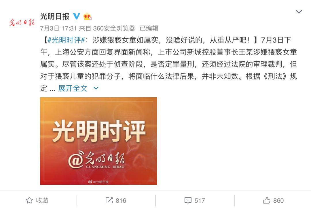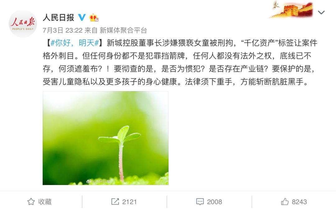 新城控股董事长涉嫌猥亵女童被刑拘,“千亿资产”标签让案件格外刺目。但任何身份都不是犯罪挡箭牌,任何人都没有法外之权,底线已不存,何须遮羞布?!