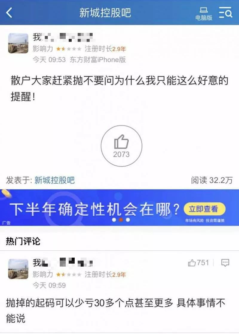 长安街知事(微信ID:Capitalnews)注意到,早在昨日上午,已有股民在新城控股贴吧发帖预警,建议大家赶紧抛,不要问为什么。