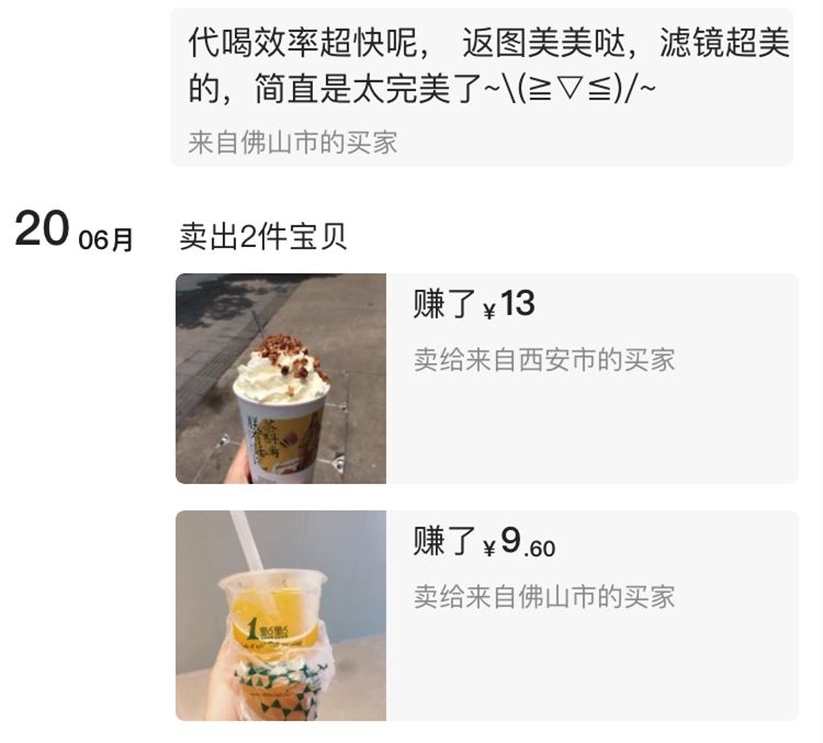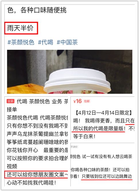 超过十块钱的代喝,一般都会强调自己能附上几百字的吃后感,力求用文字的力量唤醒你的味觉和唾液腺分泌,仿佛置身五一广场,嘴里是奶茶的香甜,鼻腔里却能嗅到隔壁米粉店的呛辣。