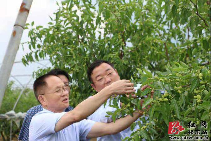 赵运林一行首先来到风石堰镇紫冲村的祁东酥脆枣种植基地。一排排结满果实的枣树,让人眼前一亮,引起了赵运林的浓厚兴趣。他就祁东酥脆枣的种植技术、生产标准、生物工程、产业融合及长远发展等方面与新丰果业负责人进行了深度的交流、探讨。