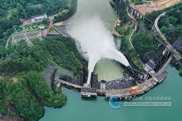 7月8日16时30分,浙江省丽水市云和县紧水滩水库开闸预泄,为应对后续强降雨腾出库容。(本报通讯员 刘海波/摄)