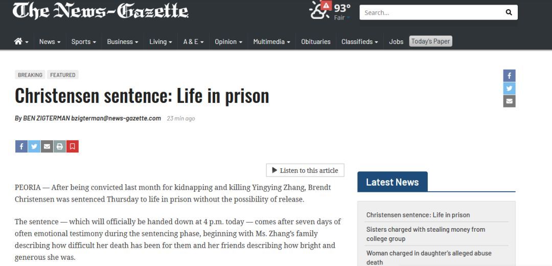 终身监禁!备受瞩目的中国访问学者章莹颖在美遇害案迎来最终审判。据美国媒体《The News-Gazette》消息,美国中部时间7月18日下午4点,北京时间7月19日早晨5点,美国伊利诺伊州皮奥里亚联邦法院12名陪审团成员作出最后裁决——判处被告布伦特·克里斯滕森终身监禁。