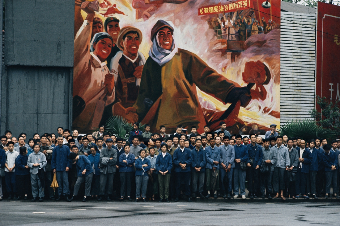 布鲁诺·巴贝,工人们欢迎法国总统蓬皮杜的车队,上海,摄影,艺术微喷,1973,75×110cm 这位来自红、白、蓝之国的摄影家,同样也在中国发现了百业初兴热情的红、理想主义纯粹的白、集体记忆怀旧的蓝。