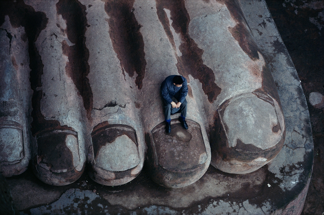 布鲁诺·巴贝,坐在乐山大佛的脚趾上,乐山,摄影,艺术微喷,1980,100×150cm 正如巴贝所言,“能把一个处在历史决定时刻的现代国家用照片记录下来是一件非常令人激动的事”。