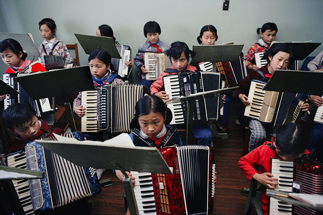 布鲁诺·巴贝,上海少年宫手风琴班,上海,摄影,艺术微喷,1980,75×110cm 在彩色摄影尚未得到重视的时代,巴贝率先尝试柯达克罗姆彩色胶卷,这在当时是颇有勇气的先锋之举。