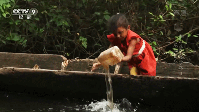 拿着舀水的工具,