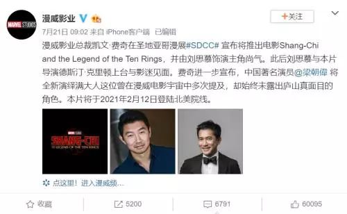 近日,漫威影业总裁凯文·费奇公布,将于2021年推出电影《尚气和十戒传奇》,主角尚气由加拿大华人演员刘思慕出演,梁朝伟出演反派满大人,美籍中韩混血女星奥卡菲娜也将加盟该片。