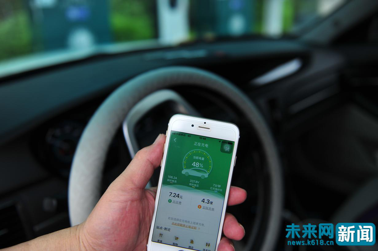 未来网天津7月31日电(记者 刘文静 何欣)在京津塘高速徐官屯服务区的电动汽车充电站,电动汽车车主正在为汽车进行充电。运用大数据和互联网技术,打开“e充电”手机App,即可查看充电情况、进行结算,和查找下一最近充电站等。
