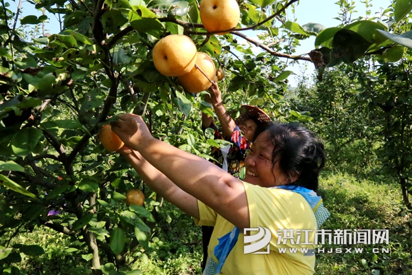 “村里很多妇女都在这里做事,她们给梨园除草,给梨子套袋、采摘等,一天能挣一百块钱。空闲时在这里帮忙一年可以赚4000多块钱,也能帮我们改善家庭生活条件,挺不错的!“当地村民周宏英边采摘边开心地说。