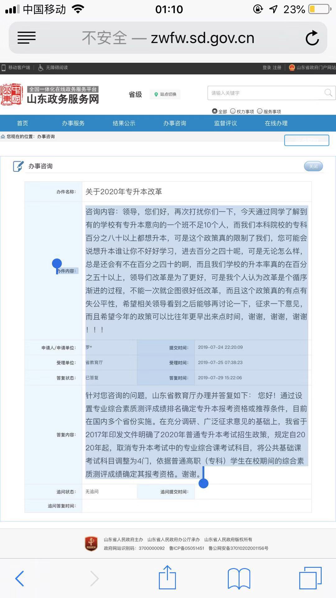 澎湃新闻发现,7月中旬以来,山东政务服务网已有上百条网友留言,就“专升本”报考资格问题咨询山东省教育厅。