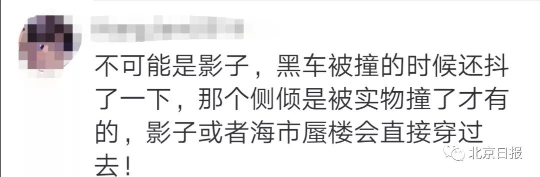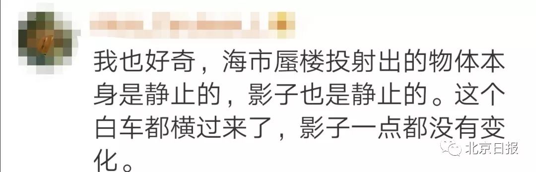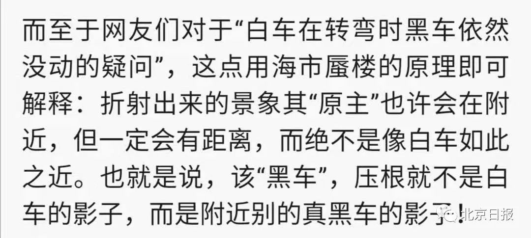 还有网友指出,根据“海市蜃楼”的原理:“黑车”应该不是白车的影子,而是附近别的黑车的影子。