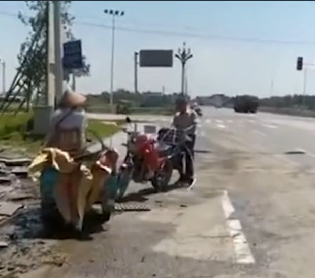 事发现场,村民将井盖捆绑在自己摩托车上 视频截图