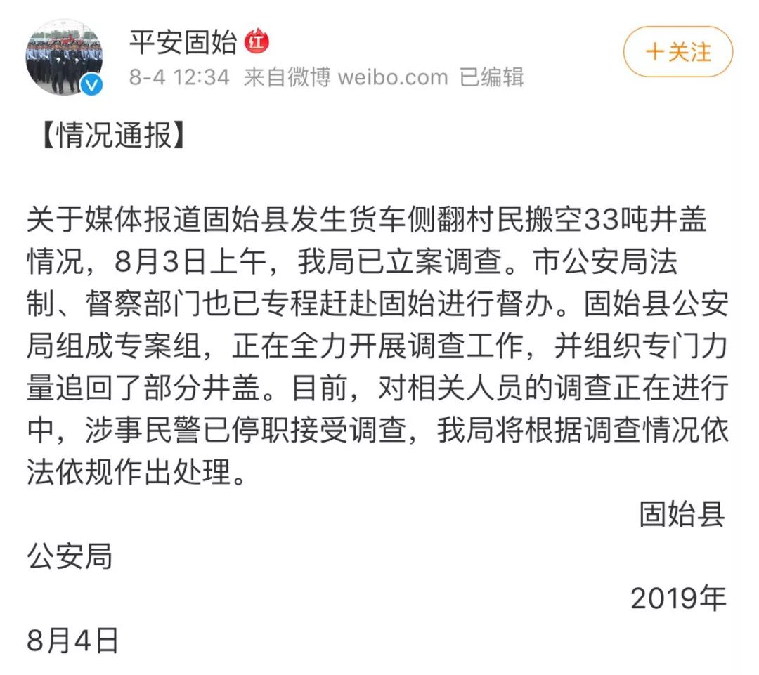 同时,固始县公安局也在4日对“村民哄抢井盖”事件给出新的回应:8月3日上午,固始县公安局已组成专案组进行调查工作,还组织专门力量追回了部分井盖。目前,对相关人员的调查正在进行中,涉事民警已停职接受调查。