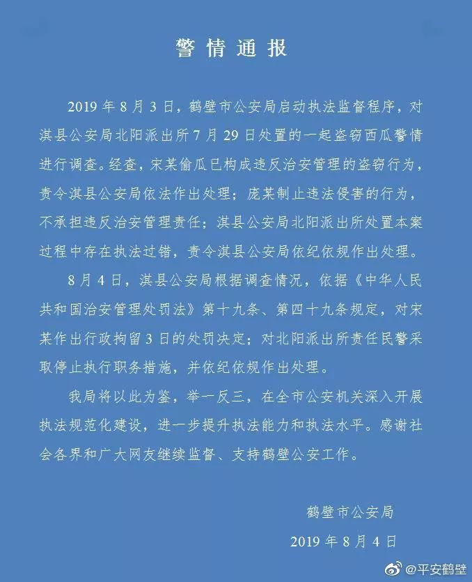 3日,鹤壁市公安局也发布情况说明,表示已启动对“偷瓜事件”执法监督程序。4日,鹤壁市公安局再次回应称,宋某偷瓜已构成违反治安管理的盗窃行为,责令淇县公安局依法作出处理;庞某制止违法侵害的行为,不承担违反治安管理责任;淇县公安局北阳派出所处置本案过程中存在执法过错,责令淇县公安局依法依规做出处理。