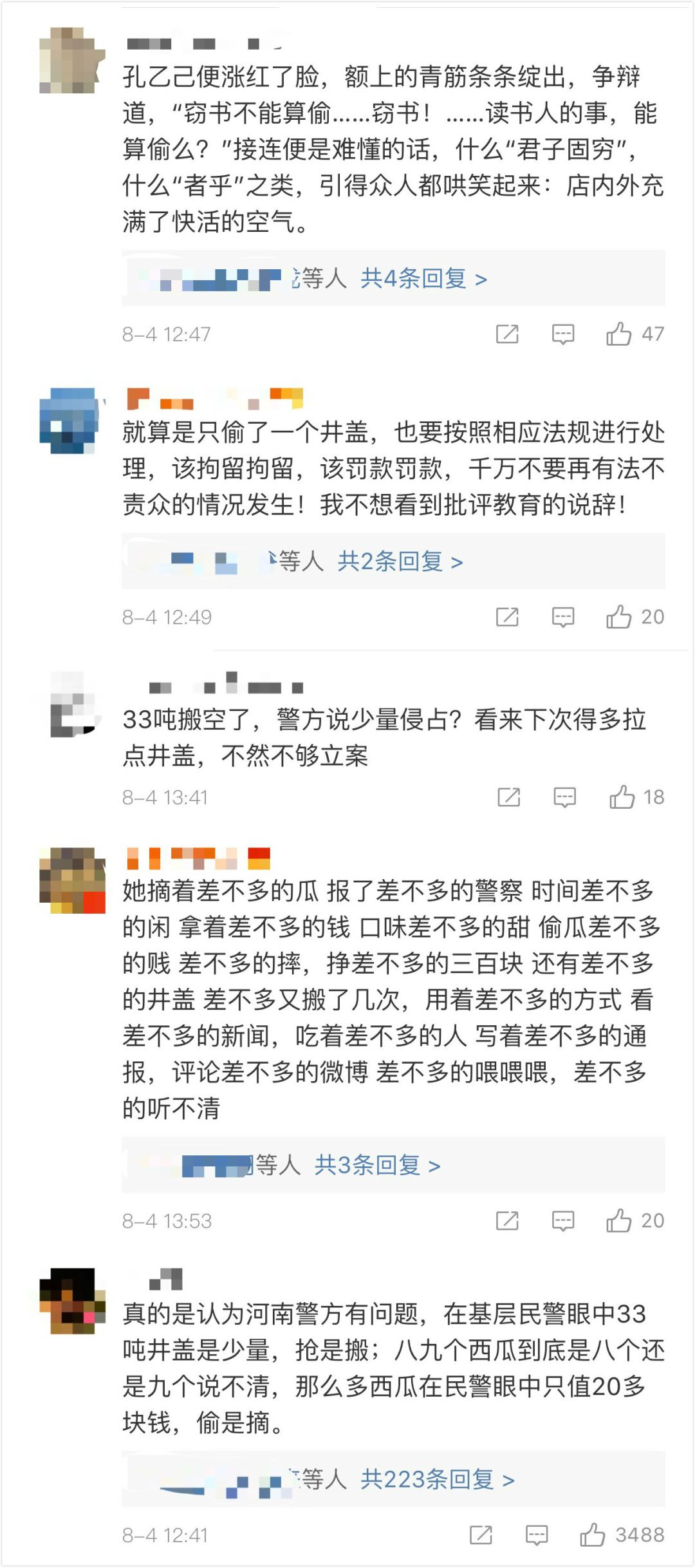 而对于“哄抢井盖事件”,也有网友联想到了鲁迅文章中,孔乙己为自己偷盗行为辩解的托词: