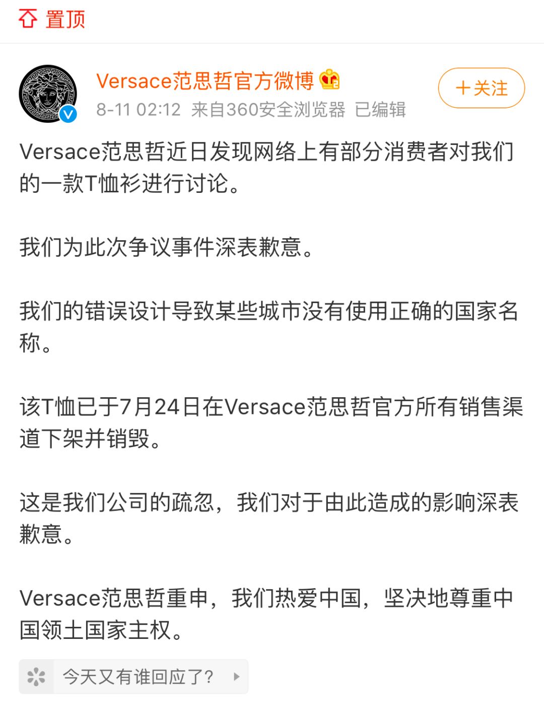近日,意大利奢侈品牌Versace范思哲的一款T恤因把香港和澳门列为单独国家引发争议。范思哲11日凌晨对此道歉,并称该T恤已于7月24日在官方销售渠道下架并销毁。