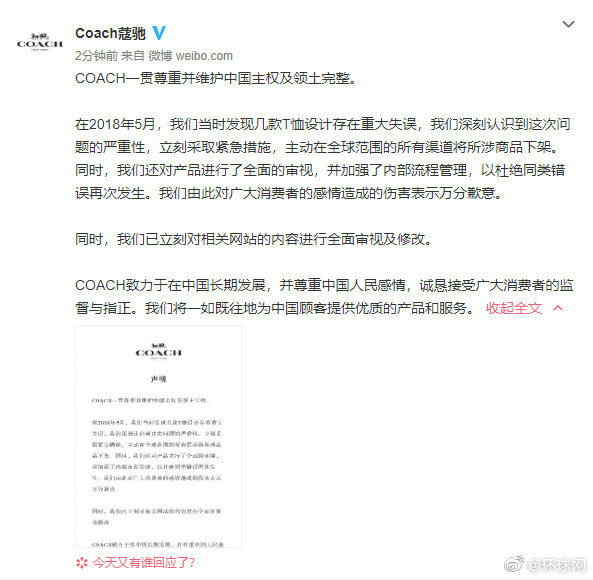 12日中午,蔻驰在其官方微博就“T恤及官网将香港、澳门和台湾列为国家”一事发表道歉声明。声明说,“在2018年5月,发现几款T恤设计存在重大失误,深刻认识到问题的严重性,立刻采取紧急措施,主动在全球范围的所有渠道将所涉商品下架”。此外,声明还表示,已立刻对相关网站的内容进行全面审视及修改。声明最后表示,“COACH致力于在中国长期发展,并尊重中国人民感情,诚恳接受广大消费者的监督与指正”。