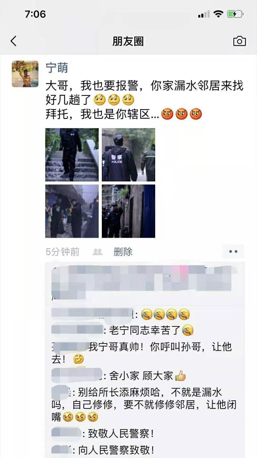 原来,这是振兴街派出所副所长宁继勇妻子发的朋友圈,下面的留言中,有理解、安慰的,还有人开玩笑说,“别麻烦警察,警察是大家的”,更多的是向这位大忙人警察致敬的。