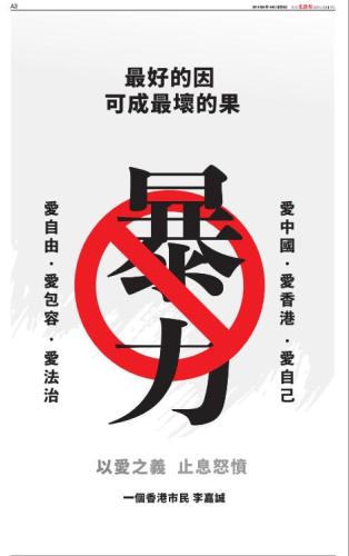 声明正中间为一个禁止暴力的图标,左侧写着“爱自由·爱包容·爱法治”,右侧写着“爱中国·爱香港·爱自己”。正上方的标题则为“最好的因 可成最坏的果”,下方写有“以爱之义 止息怒愤”,署名为“一个香港市民 李嘉诚”。