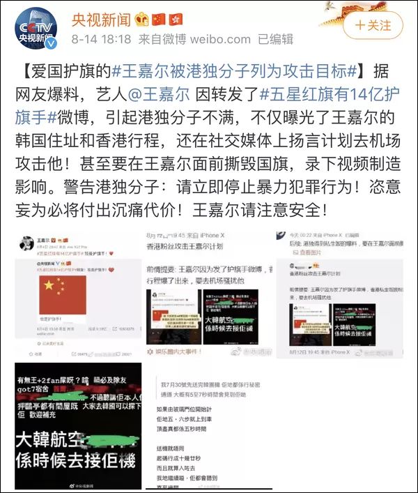 这些人不仅曝光了王嘉尔的韩国住址和香港行程,还扬言计划进行攻击,还要在其面前撕毁国旗。