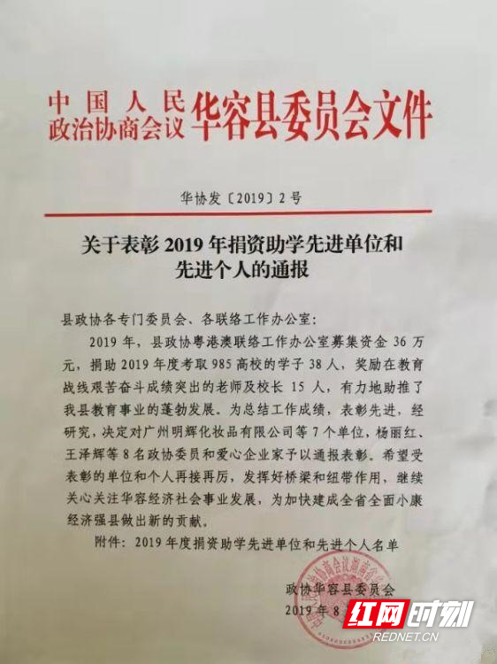 2019年,县政协粤港澳联工办募集资金36万元,捐助县域高中2019年度被“985”大学录取的学生38人,奖励在教育战线艰苦奋斗成绩突出的老师及校长15人。
