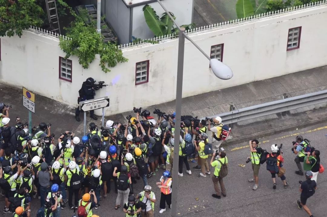 那天,香港一幅暴动现场的照片刷了屏:一名擎枪警察守在街角瞄准暴徒,但半百穿着反光背心的记者却拿着摄影机瞄准着他。