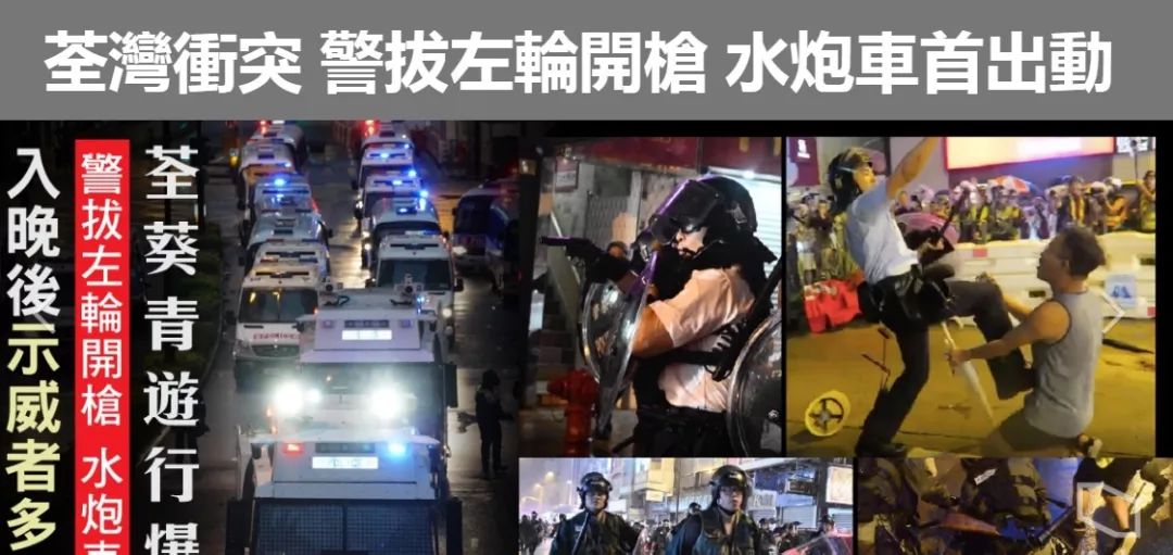 这一幕被拍下没多久,昨晚,激进示威者在香港荃湾与警方发生冲突,危急之下,警察鸣枪一响自卫、随即“拔枪”的画面,又成了港媒报道的重中之重。