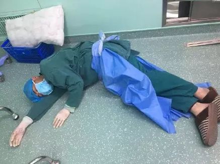 做完最后一台手术,疲惫又饥饿的他,来不及换下手术服,便倒在地上睡着了。