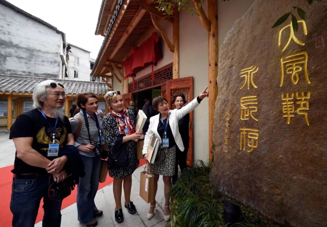 陈建国(左一)带领法国籍华人音乐家吴冰(右二)等人参观《采茶舞曲》纪念馆。(图片由受访者提供)