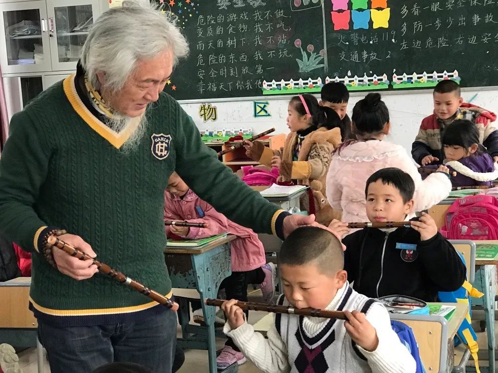 陈建国(左一)给温州泰顺县东溪乡中心小学的学生们上笛子课。(图片由受访者提供)