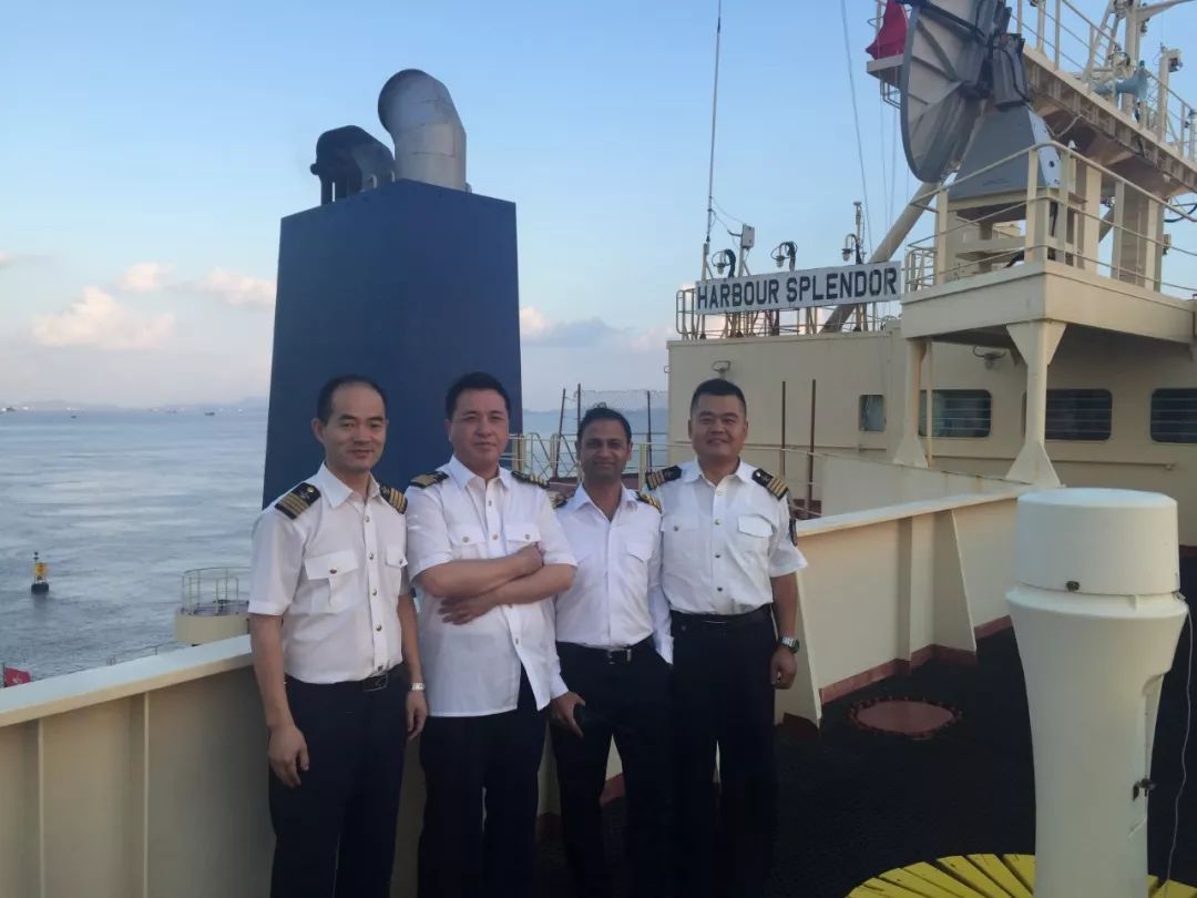 浙江舟山岙山码头30万吨级油轮靠泊成功后,邵建国(左一)与同事和船长合影。(图片由受访者提供)