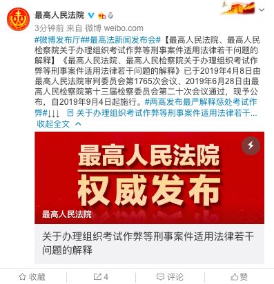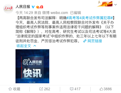 9月3日,最高人民法院、最高人民检察院联合对外发布《关于办理组织考试作弊等刑事案件适用法律若干问题的解释》。