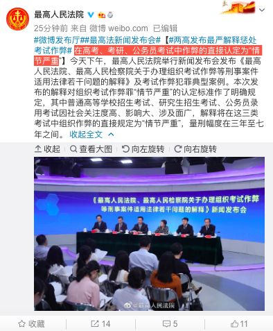 据最高法有关负责人介绍,普通高等学校招生考试、研究生招生考试、公务员录用考试社会关注度高、影响大、涉及面广。在这三类考试中组织作弊的直接规定为“情节严重”;
