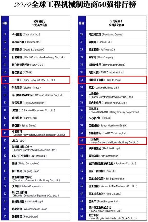 与上一年的名次相比,三一重工、中联重科和铁建重工均上升1位;山河智能进步最大,上升6位。