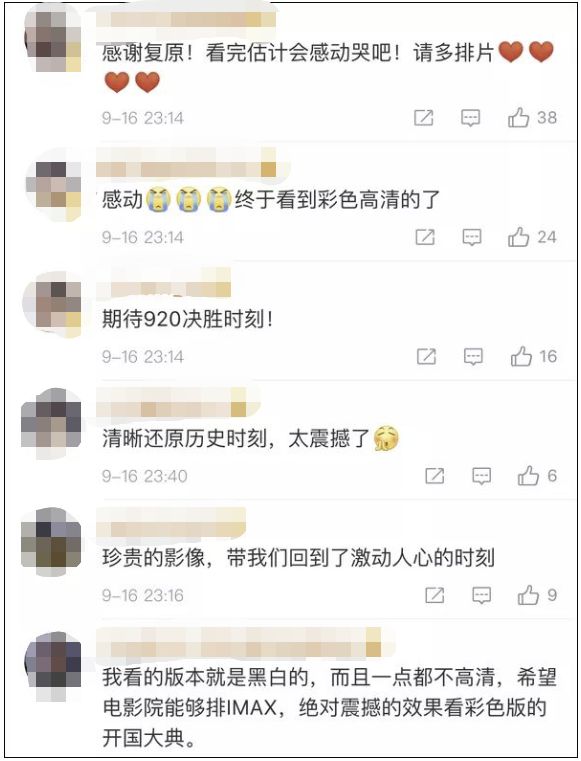 一直到9月16日片方突然在官方微博中放出了一波“神级”剧照,将经过修复的开国大典彩色高清画面首次呈现在大荧幕上,让观众仿佛身临现场,真切感受到穿越时空的震撼,这才在网上引起热议。