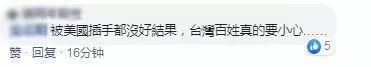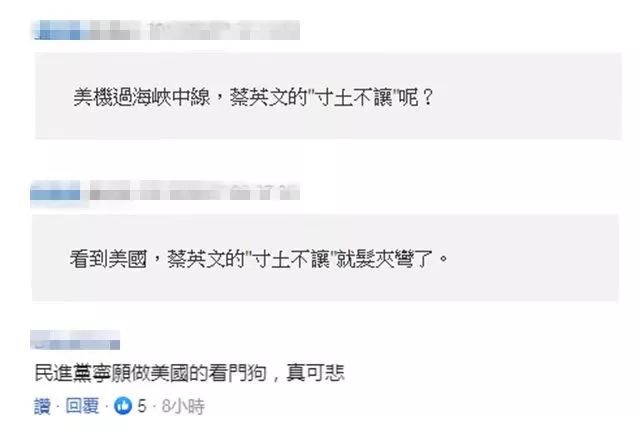 对此,有岛内网民怒问,美机过“海峡中线”时,蔡英文的“寸土不让”呢?看到美国,蔡英文的“寸土不让”就“发夹弯”了;还有网友怒骂,民进党宁愿做美国的看门狗,真可悲。↓