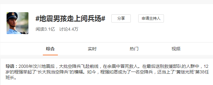据@未来网,2008年汶川地震后,大批空降兵飞赴前线,在余震中冒死救人。在最后送别救援部队的人群中,12岁的程强举起了“长大我当空降兵”的横幅。2015年,19岁的程强向连队递交参加纪念抗战胜利70周年阅兵申请书,因为身高差3厘米而与阅兵失之交臂。4年后,程强身高增长了5厘米,还成为“黄继光班”第38任班长。这一次,他如愿以偿站到了庆祝中华人民共和国成立70周年阅兵的训练场上。“地震男孩走上阅兵场”的故事立刻引来舆论关注。