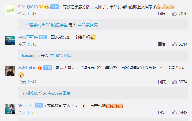 “学霸方队”受到了网民的热烈点赞和表白,@央视新闻 单条微博点赞达23万个,“请问还缺对象吗?”“求国家分配兵哥哥”刷屏评论区。