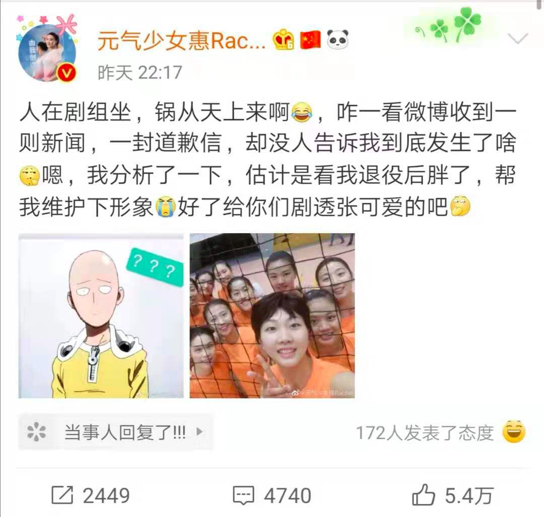 当晚,惠若琪也在微博上回应此事:估计是看我退役后胖了,帮我维护下形象。↓↓↓
