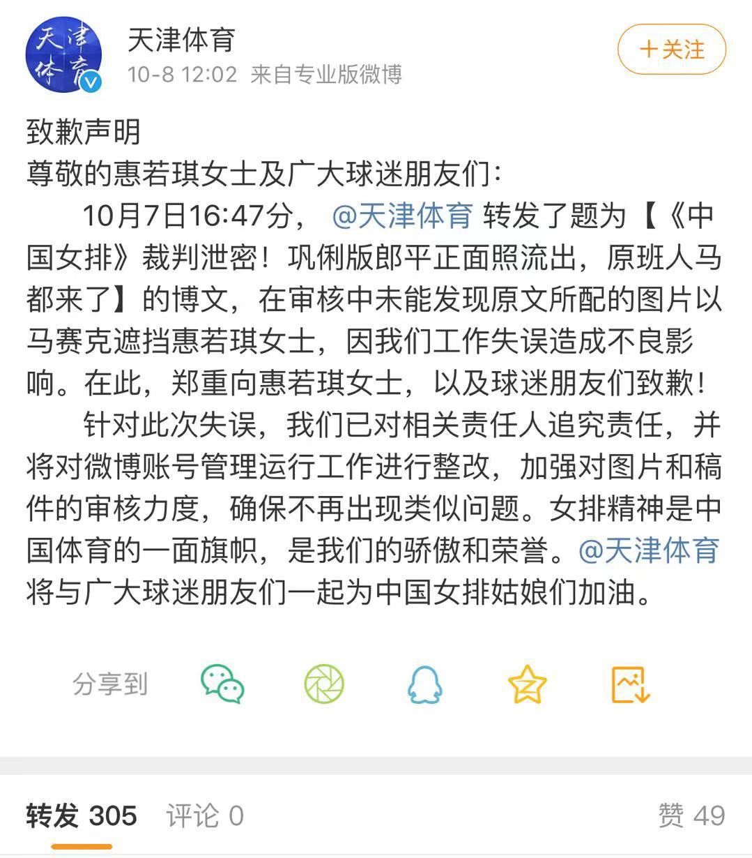 随后,@天津体育 发出致歉声明,称在审核中未能发现原文所配的图片以马赛克遮挡惠若琪,已对相关责任人追究责任。