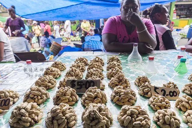 当地卖花生不用称,而是用不同大小的汽水瓶盖把花生堆起来,大堆卖5所罗门元(合人民币不到6元),小堆2所罗门元,真心不便宜。