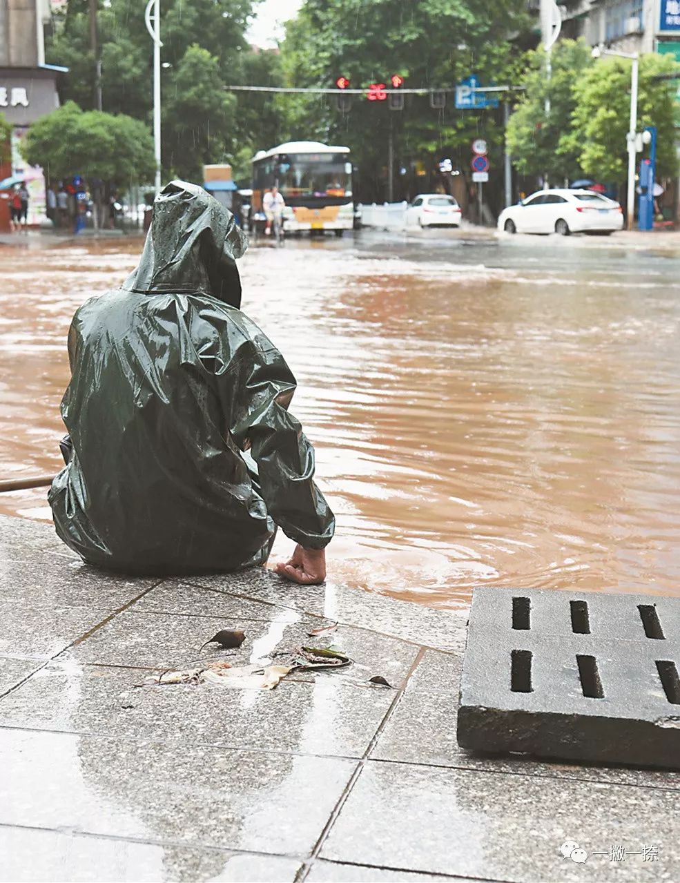 7月7日,湖南省衡阳市衡阳县出现强降雨天气,导致城区部分区域发生严重内涝。图为市政工人守护在下水道旁,防止行人误入。刘欣荣 摄