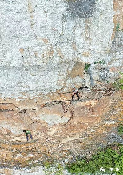 湖北省恩施土家族苗族自治州巴东县大支坪镇尚家村,壁立千仞,风光壮美。今年51岁的村民陈显兵从2017年开始,带领群众在“天心眼”绝壁上修路。图为陈显兵(左)拴着绳子在清理石头。杨顺丕 摄