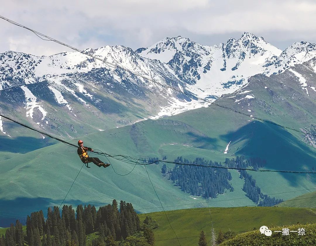 新疆伊犁哈萨克自治州尼勒克县唐布拉草原,工人在喀什河上空铺设通信光缆。当地正优化村级通信网络,推动区域空间互联互通。熊剑 摄
