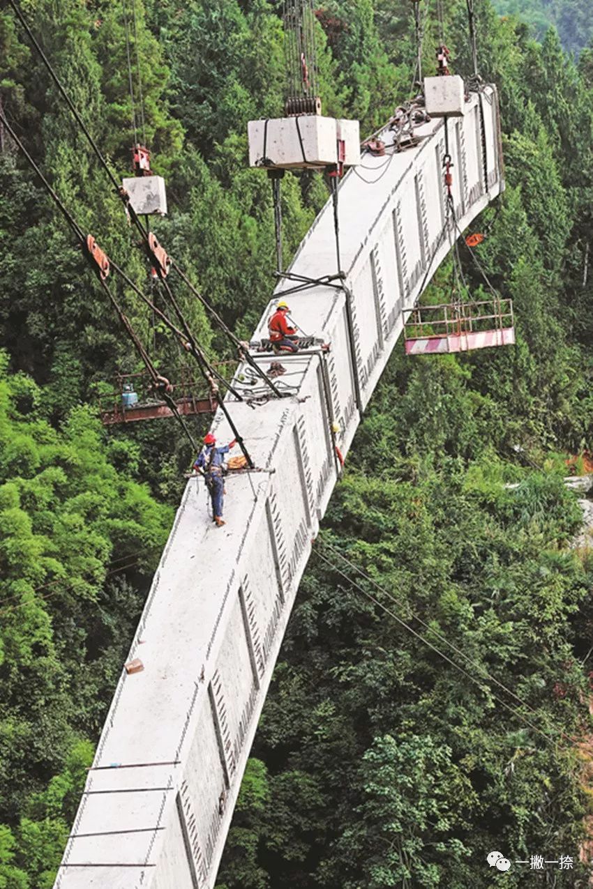 重庆市黔江区官渡峡两岸山高谷深,绝壁对峙。2018年开始,黔江区对省道304线正阳至蓬东公路进行改建。图为近日工人在官河大桥上进行吊装拱箱安装。杨敏 摄