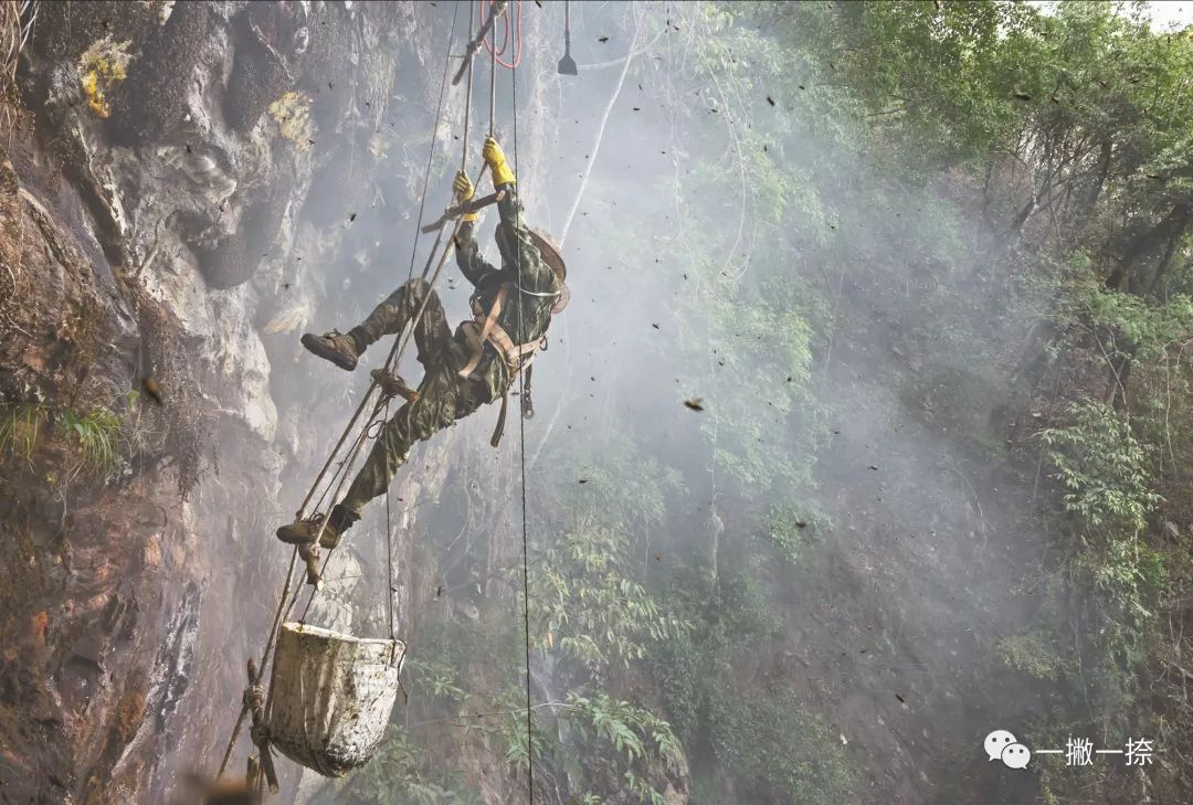 在云南省德宏傣族景颇族自治州芒市,傈僳族采蜜人正爬上悬崖采集野生蜂蜜。凯文 摄