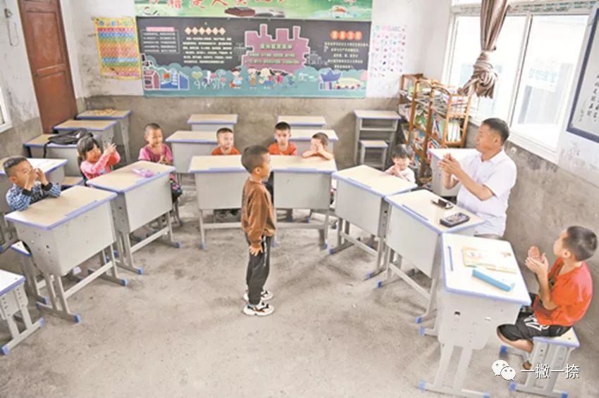 8月26日,贵州省黔南布依族苗族自治州龙里县湾滩河镇六广村谷港小学迎来新学期。这所乡村“微小学”本学期只有6名学前班孩子和4名一年级学生,学校唯一的老师、53岁的吴国先在这里教书已36年。图为8月27日,吴国先在音乐课上与学生互动。新华社记者 杨文斌 摄