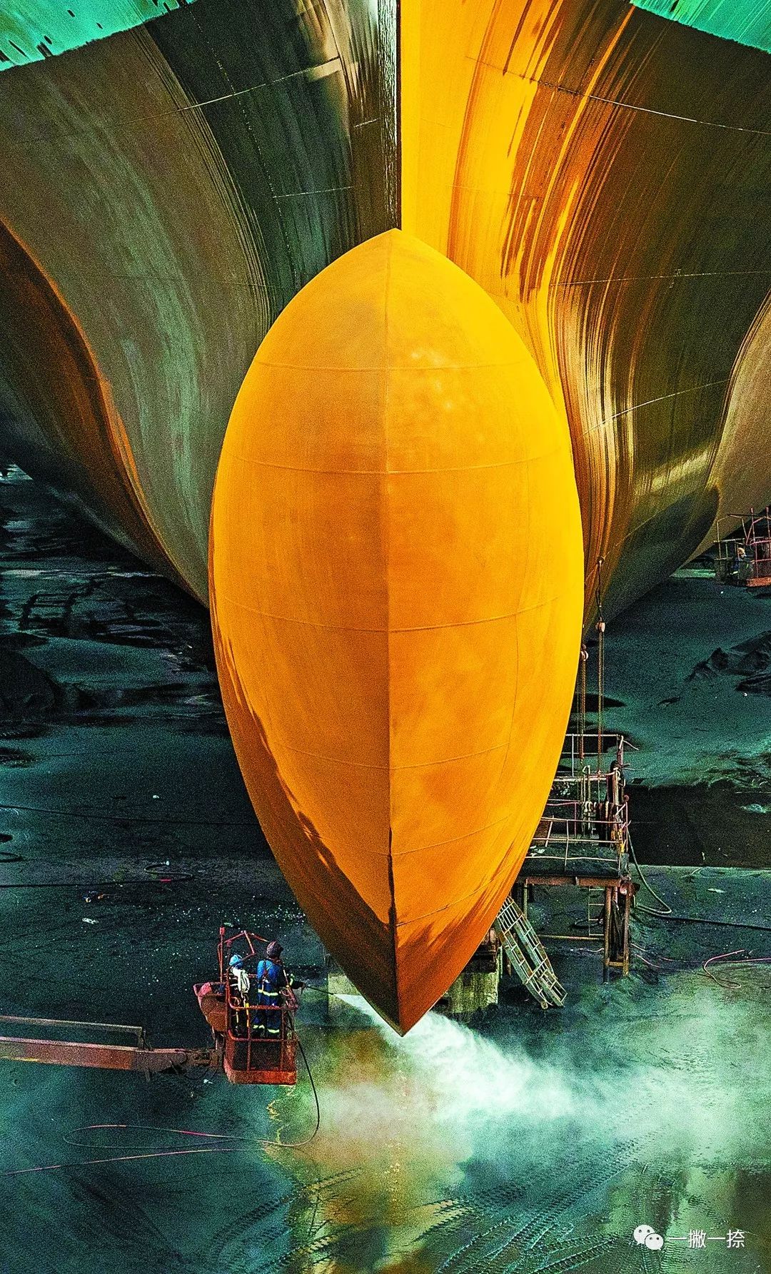 文冲船坞坐落于中国三大造船基地之一的广州市南沙区龙穴岛,拥有20万吨级和30万吨级船坞各一座,曾完成“探索一号”科考船等项目的改装。图为中船南沙文冲船坞修船工在船头喷漆。王美燕 摄