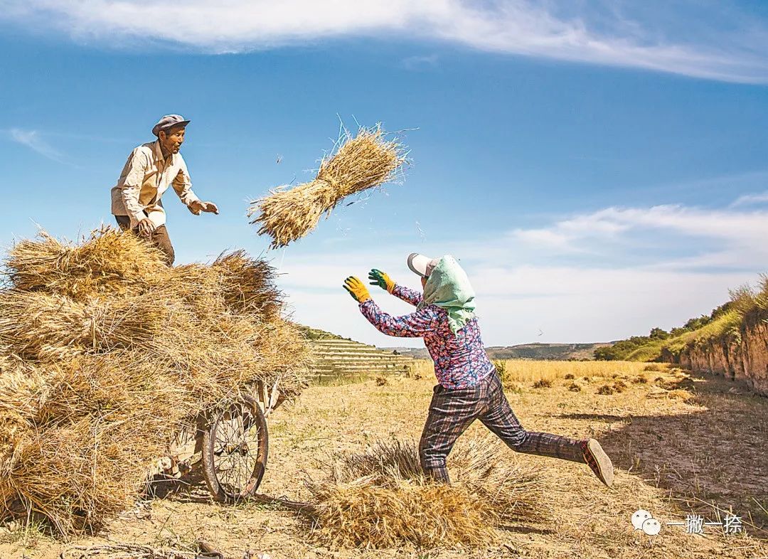7月的宁夏回族自治区固原市彭阳县,塬上金浪滚滚,一派丰收景象。图为当地红河乡的农民在搬装收割好的小麦。左雪兰 摄
